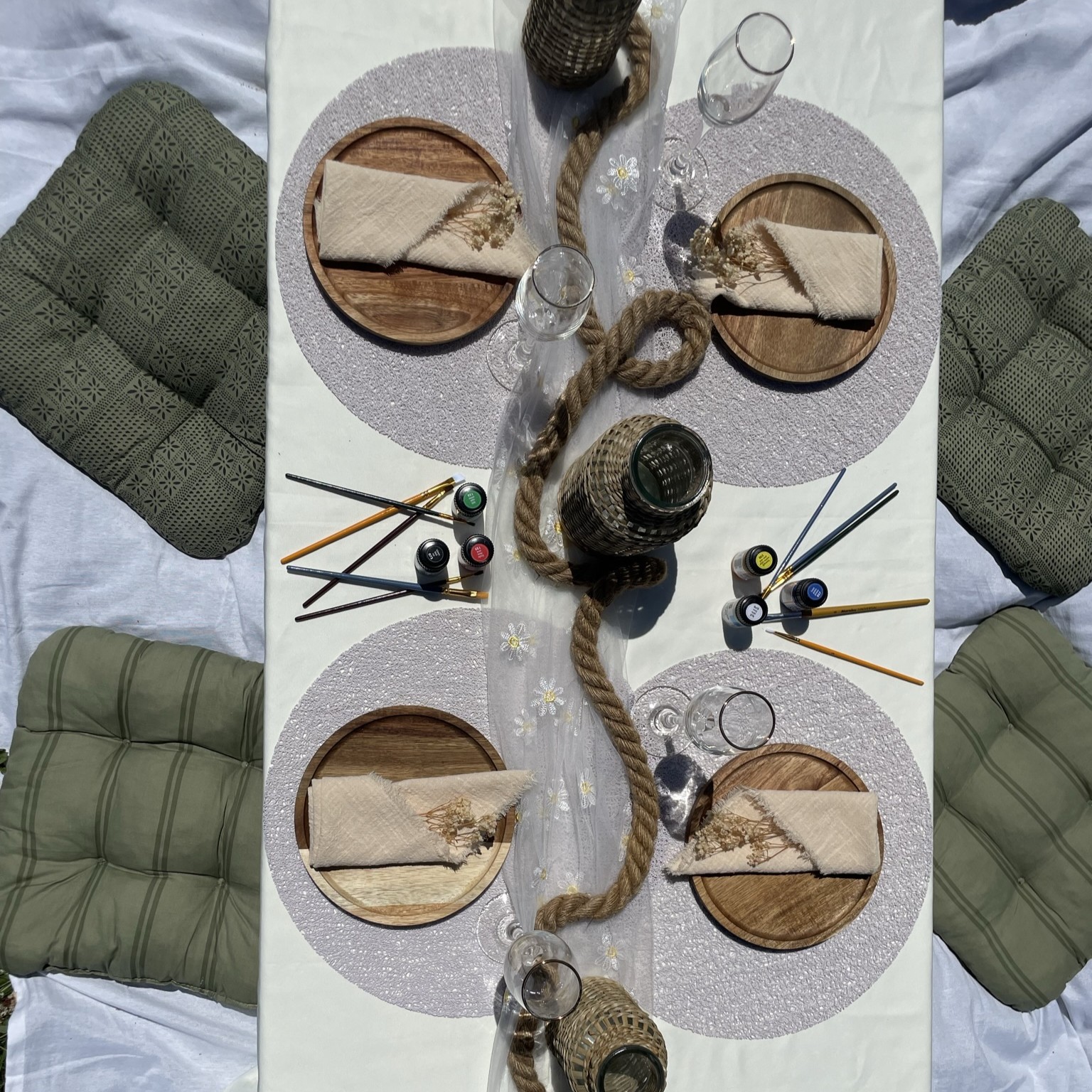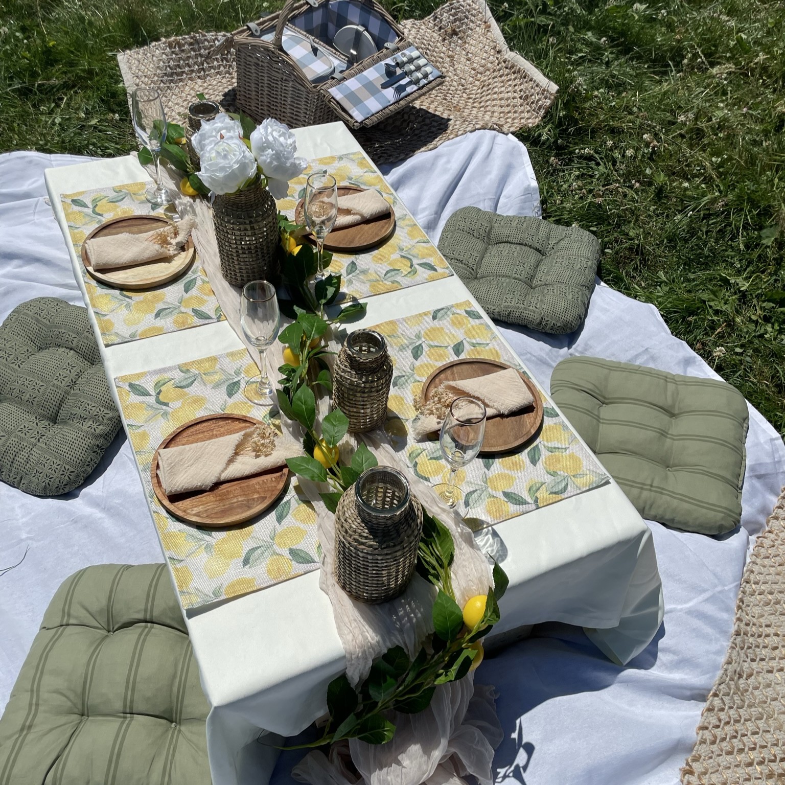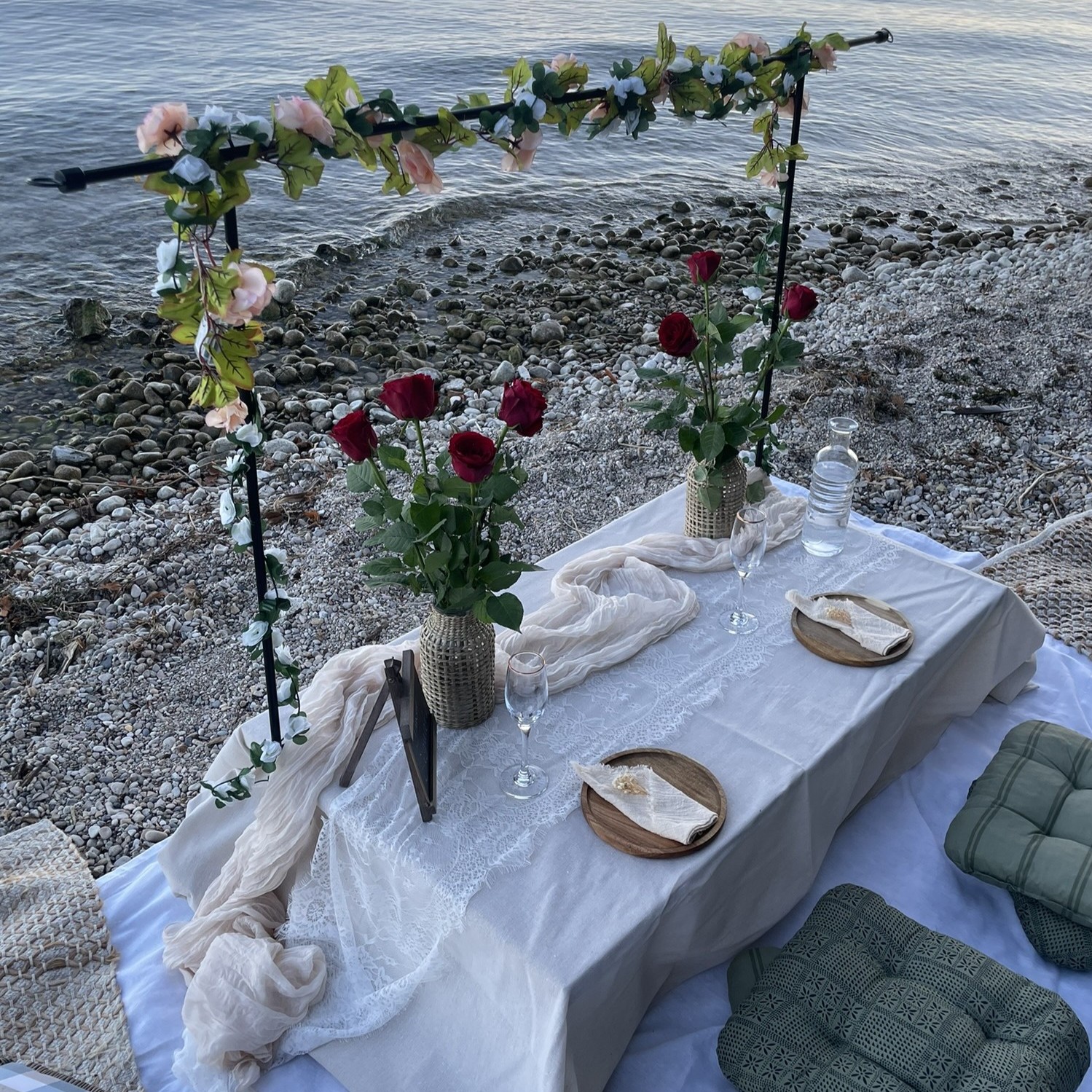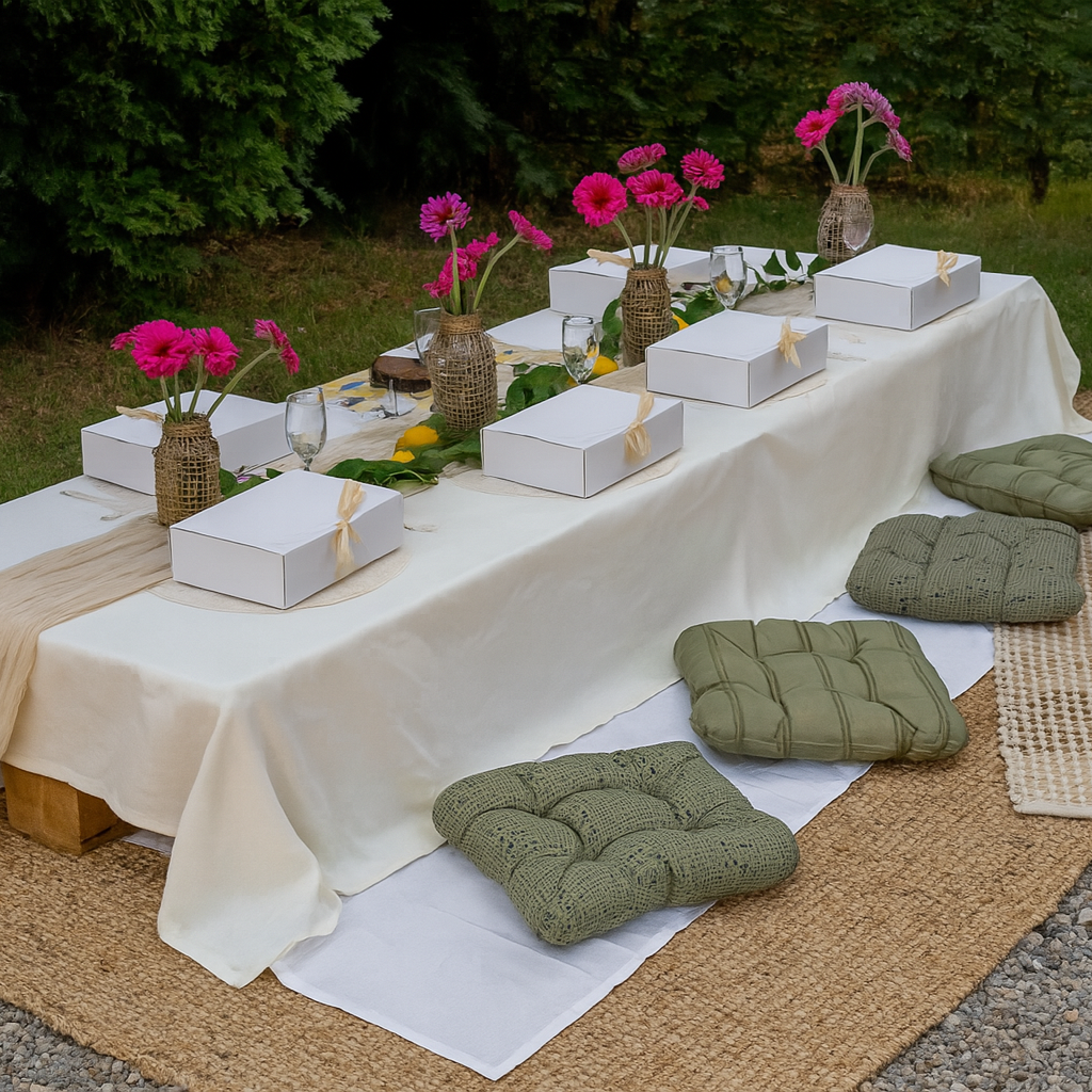 Au bord d’un lac, dans les vignes, en montagne, ou le lieux de votre choix, profitez d’un pique-nique avec une installation élégante, des tables basses décorées avec soin et une ambiance chaleureuse adaptée à votre groupe, dans des lieux publics sélectionnés pour leur calme et leur confort.