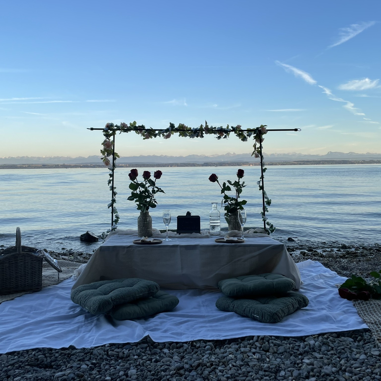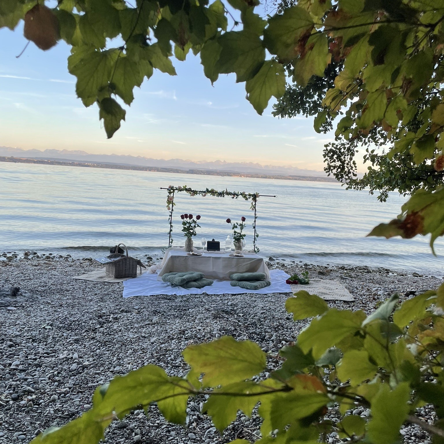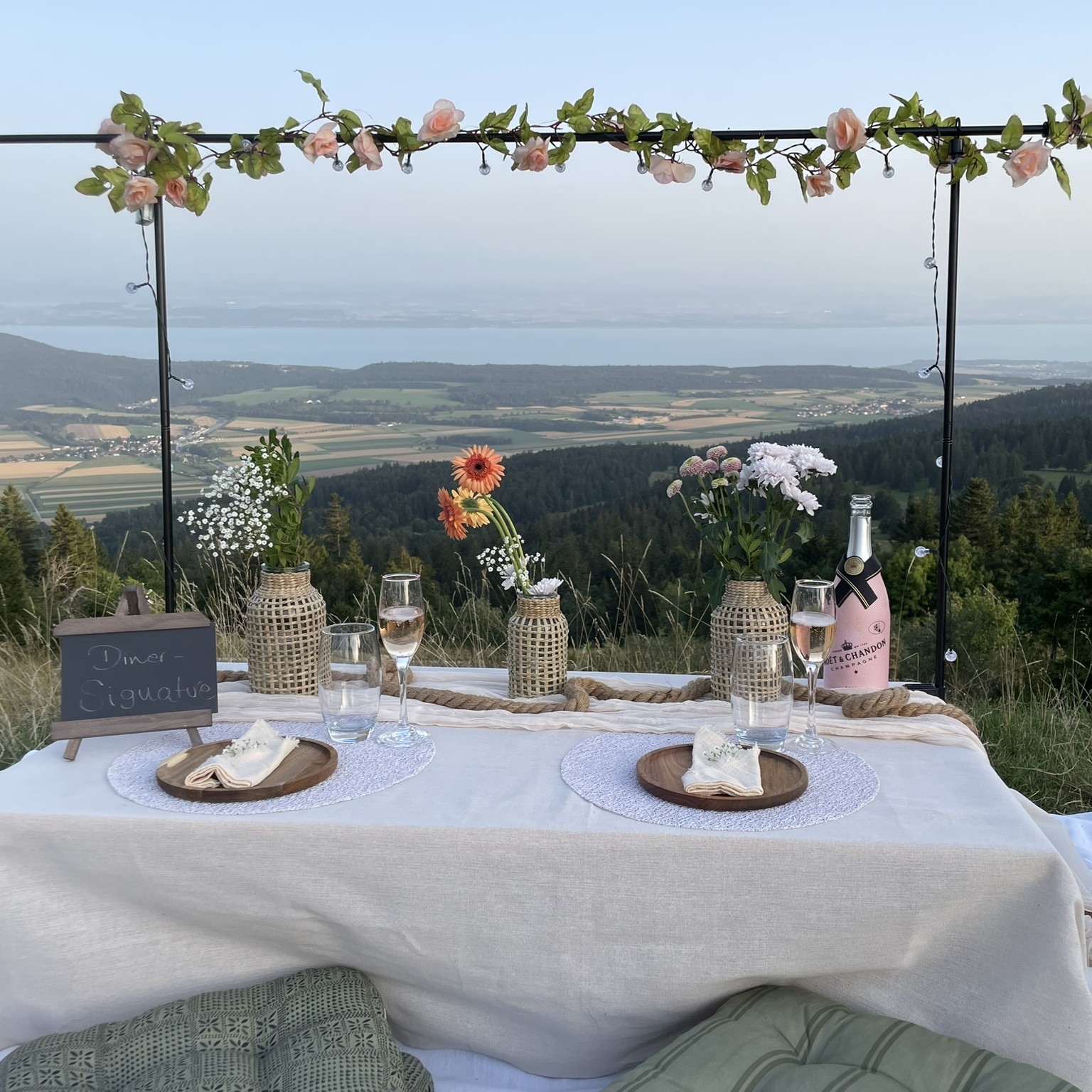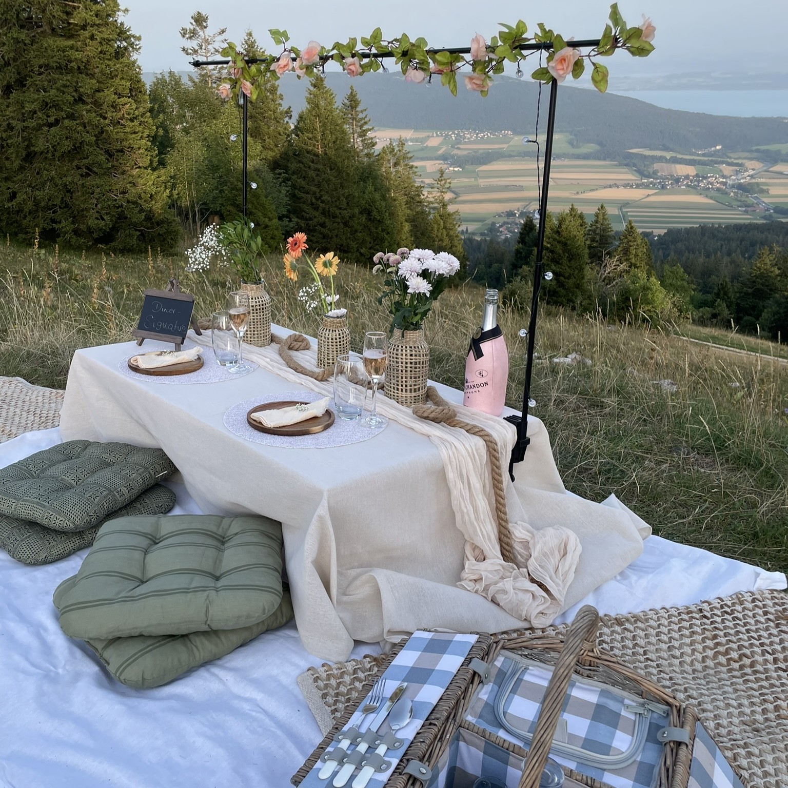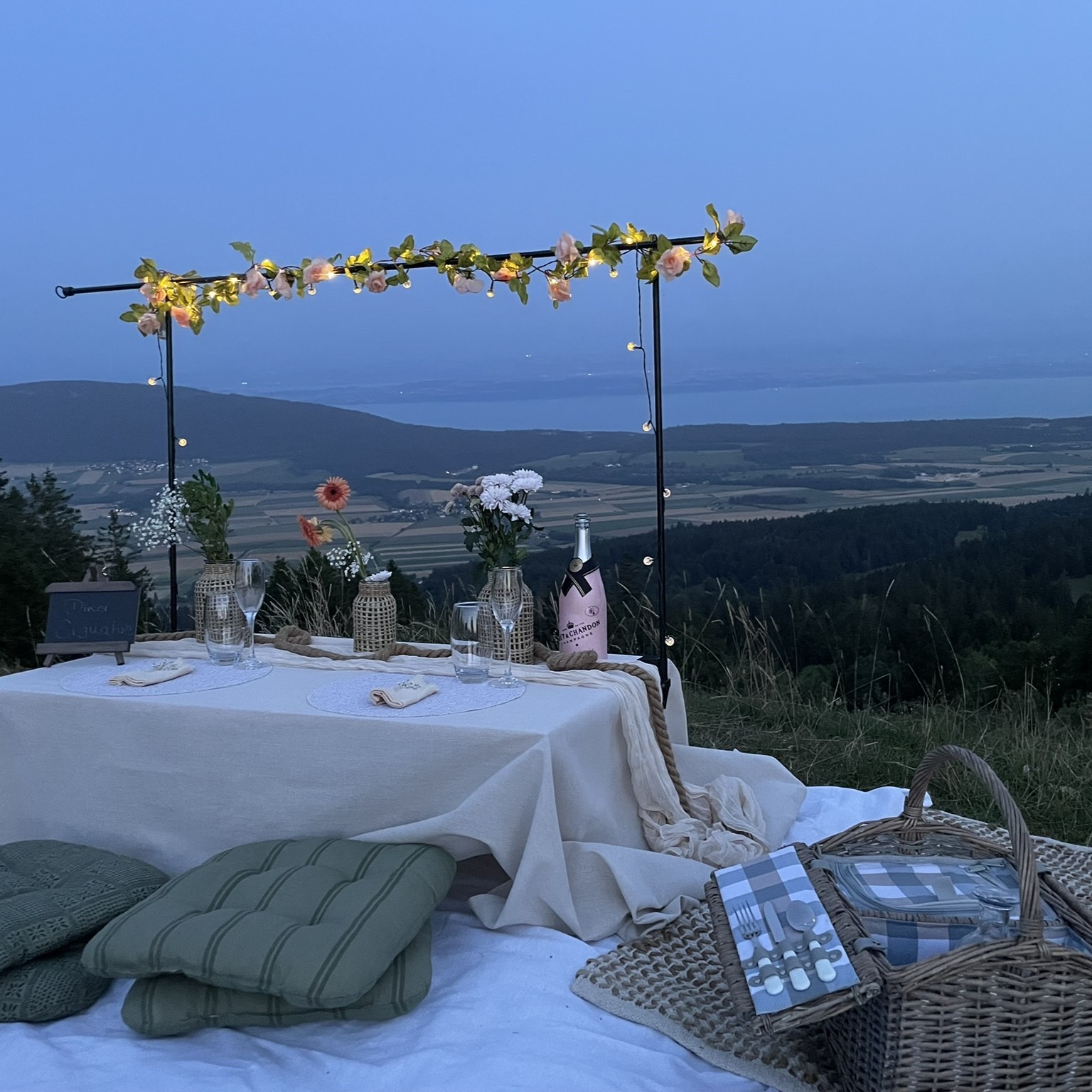 Offrez-vous une expérience unique avec notre service de pique-nique romantique en Suisse romande. Installez-vous confortablement autour d’une élégante table basse décorée avec soin, au cœur d’un cadre naturel exceptionnel.
